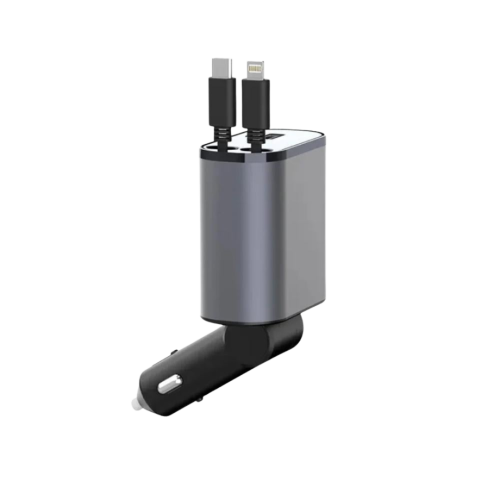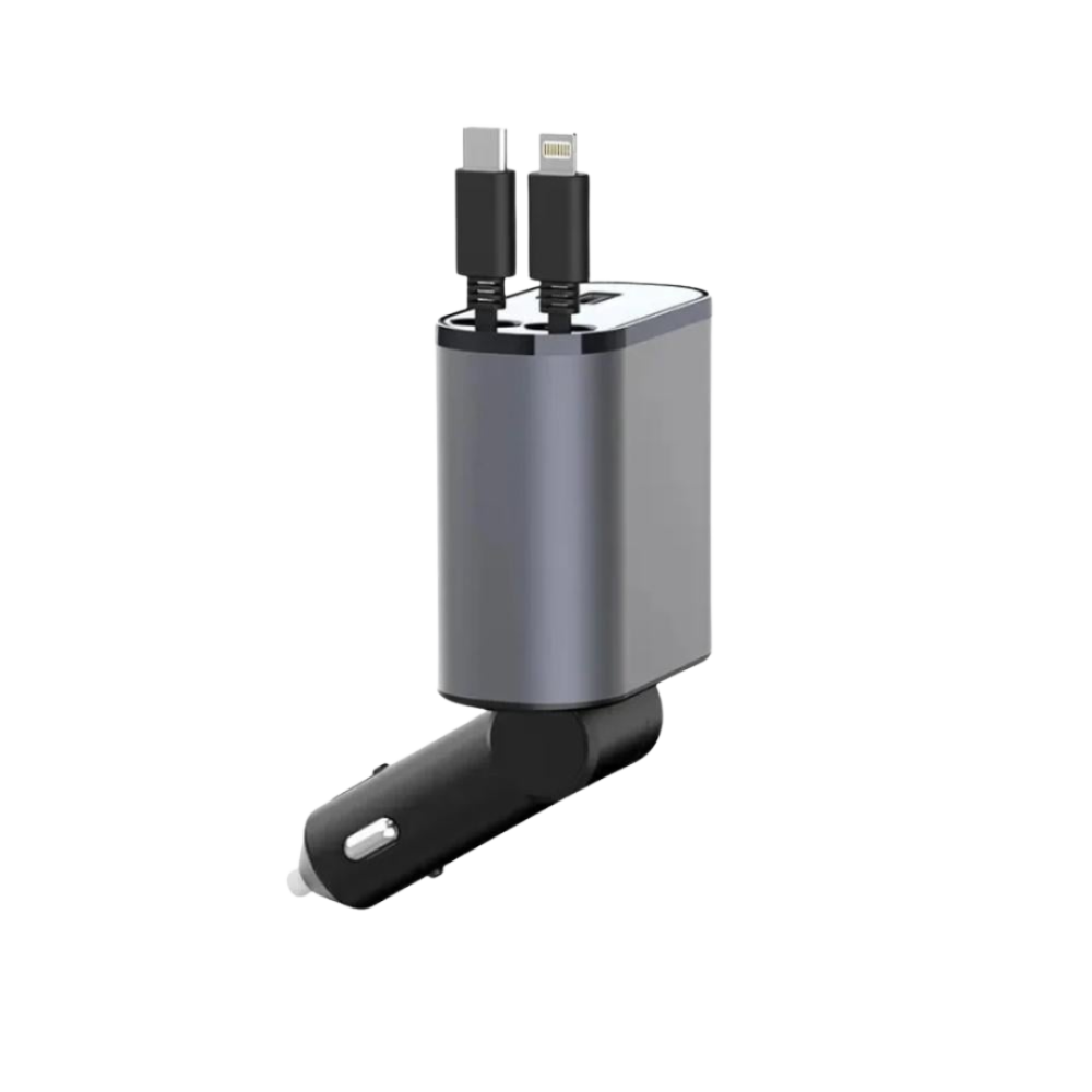 استمتع بتجربة شحن ذكية وسريعة مع شاحن السيارة المتكامل من Jeebel. يوفر لك هذا الشاحن قوة شحن تصل إلى 120 واط مع كابلين مدمجين Lightning وType-C بطول 80 سم، بالإضافة إلى منفذي شحن إضافيين USB وType-C. بفضل تصميمه العملي القابل للتدوير وتقنيات الحماية الذكية، يمكنك شحن أجهزتك بأمان وراحة أينما كنت.