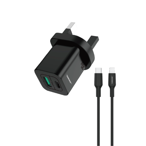 يتميز بوجود منفذين PD + QC لتوفير شحن سريع ومستقر لمعظم الأجهزة الذكية، ويأتي مع كابل Lightning معتمد من Apple (MFi) لضمان التوافق الكامل مع أجهزة iPhone.