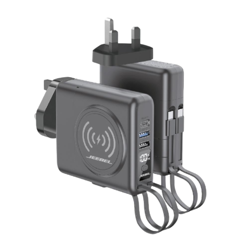 استمتع براحة الشحن المتكامل في كل مكان مع شاحن Jeebel JE-B339 الذكي، الذي يجمع بين شاحن جداري، باور بانك، شحن لاسلكي، شحن سريع PD، وكابلات مدمجة في تصميم واحد محمول.