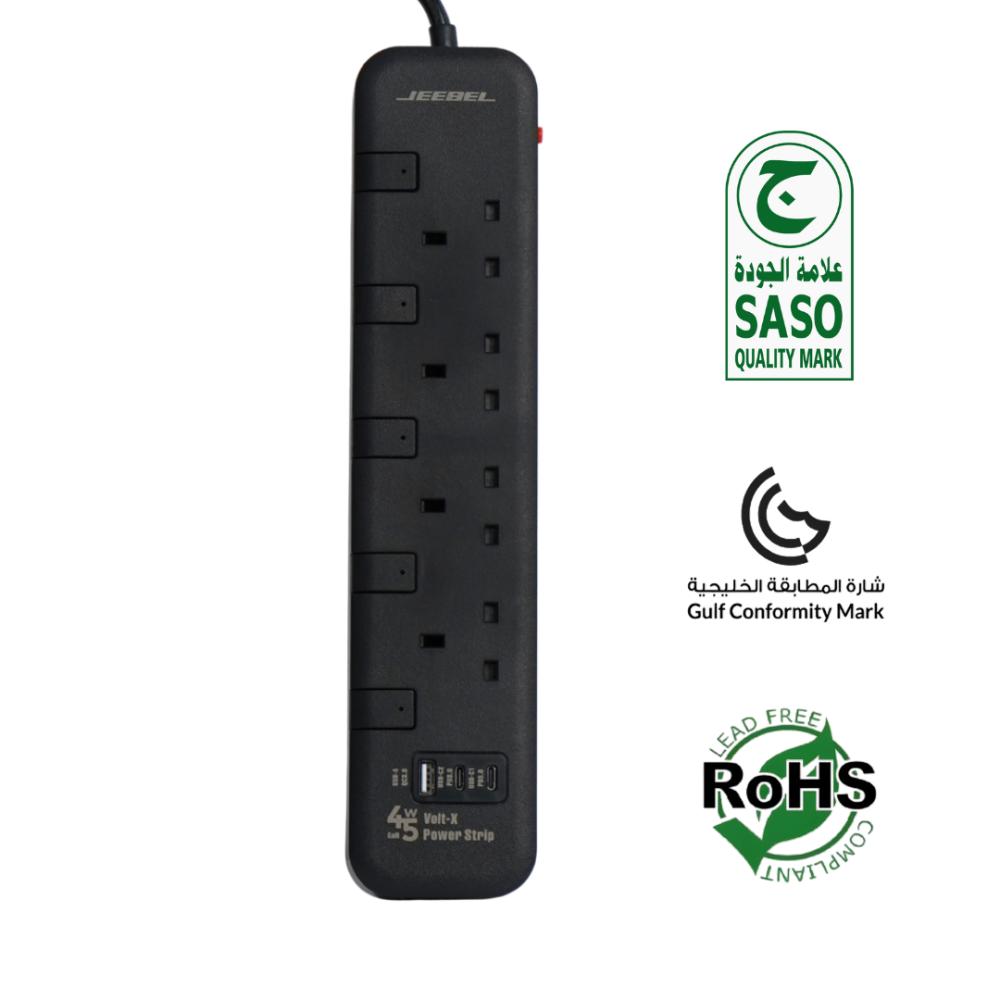انقر هنا للمزيد من Jeebelتوصيلة جيبل الكهربائية معتمدة SASO 2990 واط | شحن GaN سريع 45 واط 4 مخارج UK مستقلة + USB-C و USB-A حماية متقدمة وأمان عالي للأجهزة